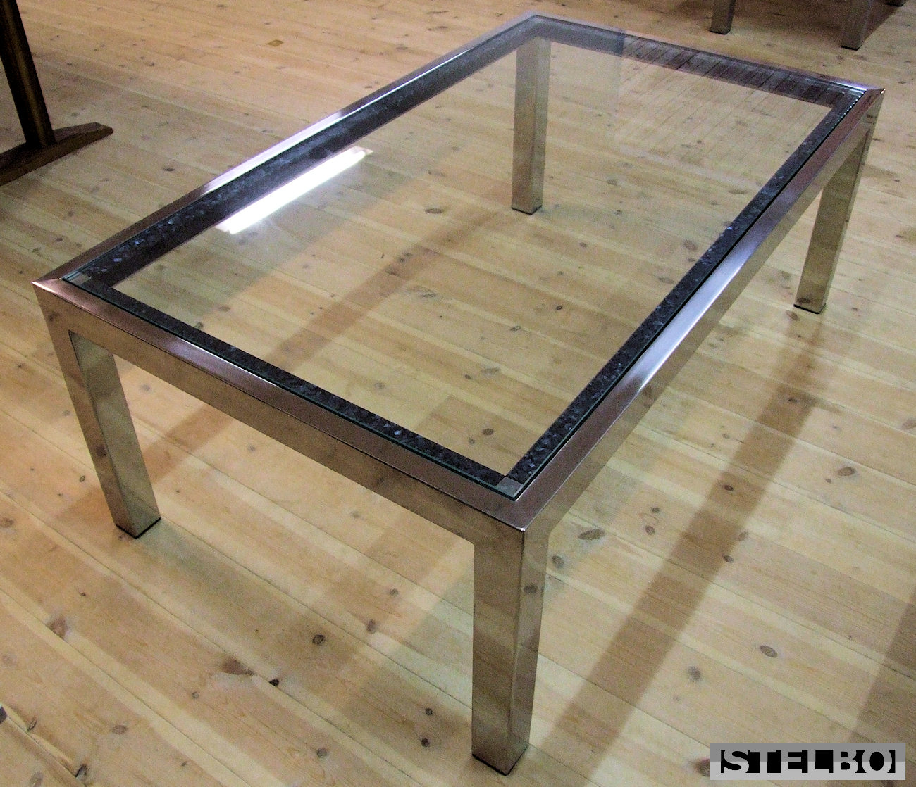 Dette glasbord er lavet i 60x60 og 60x30mm firkantede rør i poleret rustfrit stål. 12mm hærdet glasbordplade.